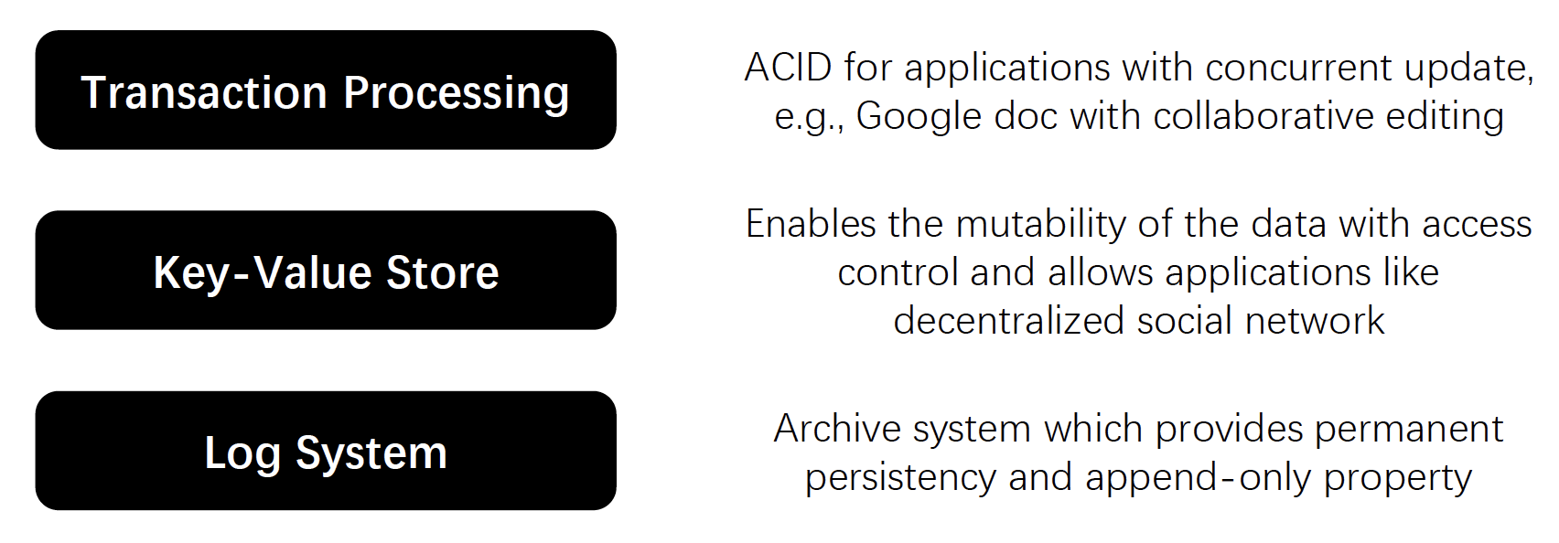 The lowest is a log layer which is a decentralized system. It consists of multiple storage nodes to form a storage network. The network has built-in incentive mechanism to reward the data storage. The ordering of the uploaded data is guaranteed by a sequencing mechanism to provide a log-based semantics and abstraction. This layer is used to store unstructured raw data for permanent persistency.